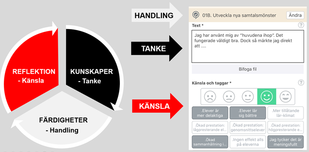 När mikroreflektion läggs till i lärprocessen ser vi mer på djupet vad som händer och vad människor lär sig. Mikroreflektion kring känsla, tanke och handling synliggör människors kunskaper och färdigheter, se figur 9.7 nedan. Tidigare hade vi bedömt kunskaper genom nedskrivna tankar (prov och tentor) och bedömt färdigheter genom handling (så kallad portfoliobedömning). Det nya här var att upprepade gånger genom mikroreflektion fånga känslan i stunden. Då blev tidigare osynliga lärprocesser synliga.
