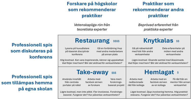 Att gå på ”restaurang” handlar här metaforiskt om att gå på traditionella konferenser och kongresser med forskare och experter som talare. Trots hög kostnad är detta populärt bland många, men hur stort är matsvinnet? Vilka av alla idéer tillämpas hemmavid? Expertråd går också att få via ”take-away”, att ta med sig till egna verksamheten utan att träffas. Detta brukar då kallas för kollegialt lärande, facklitteratur eller distansfortbildning. En del blir inspirerade, andra irriteras av varierande relevans. Att gå på ”knytkalas” handlar i stället om att praktiker utbyter beprövad erfarenhet med varandra på anordnade nätverksträffar i branschen.