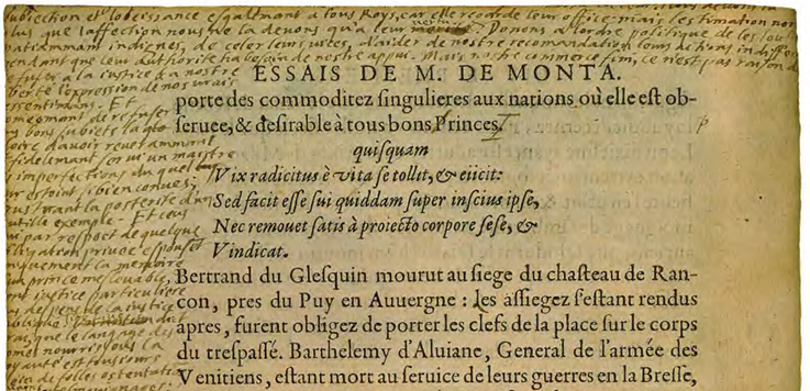 Figur 9.4. En sida ur Michel de Montaignes ”Essais” med omfattande anteckningar i marginalen av Montaigne själv. Montaigne (1533–1592) var essägenrens upphovsman, och betraktade essäskrivandet som en aldrig avslutad tankeprocess.