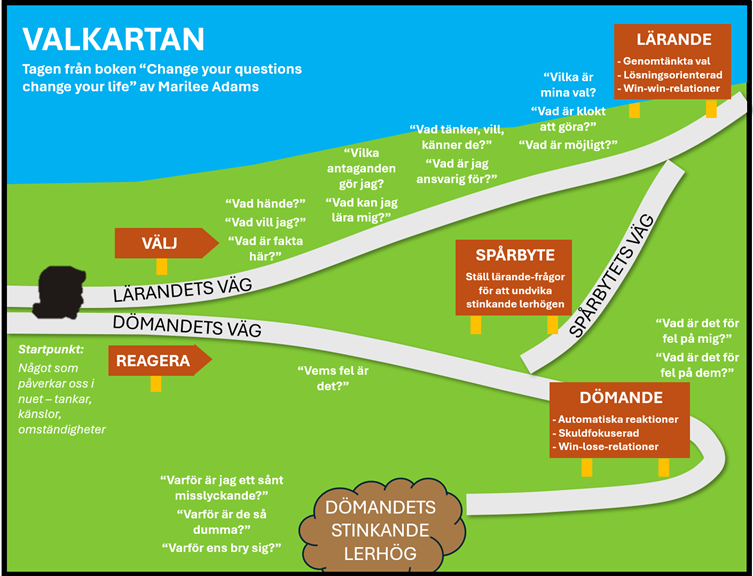 Vart ska vi då rikta vårt tankearbete mot, om vi nu lyckas sakta in? Jag har själv haft en livslång kärlek till så kallad ”uppskattande undersökning” – på engelska Appreciative Inquiry (AI). Detta är ett förhållningssätt som utgår från att organisationer förändras bäst genom att systematiskt undersöka och bygga vidare på det som redan fungerar väl, i stället för att fokusera på problem och brister. Genom att ställa generativa frågor om styrkor, tidigare framgångar och önskvärda framtider skapas energi, gemensamt lärande och riktning för fortsatt utveckling. I stället för att slå in på en dömande väg (”vems fel är det?”), så rekommenderar jag därför att vi använder vår tankepaus till att slå in på en lärande väg (”vad kan vi lära oss här?”) utifrån vad som har fungerat väl för oss tidigare. De frågor vi då ställer kan faktiskt förändra våra liv. Figur 9.3 nedan kommer från AI-litteraturen, och kan vara en av de figurer som påverkat mig mest i livet.