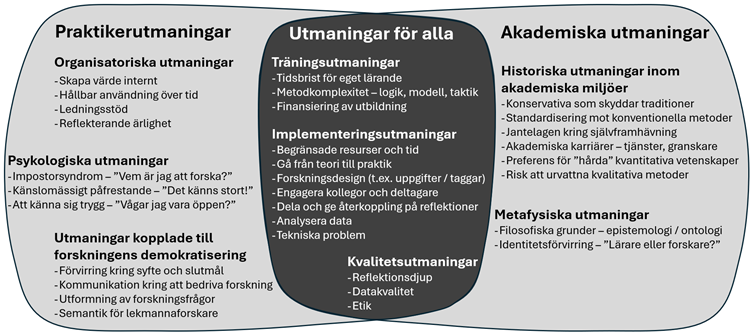 Modellen i figur 8.1 beskrivs mer detaljerat i en forskningsartikel jag presenterade på en konferens i Tyskland i juni 2025, se referens nedan. De tre första utmaningstyperna till vänster i modellen rör främst praktiker: organisatoriska och psykologiska utmaningar samt svårigheter kopplade till att arbeta vetenskapligt i helt vanliga organisationer. I mitten av modellen ser vi utmaningar alla deltagare beskriver, oavsett om de är praktiker eller forskare. Det handlar om utmaningar med att hinna följa en utbildning i DAS när vardagen rullar på, att implementera DAS i deras stressiga vardag samt att de oroar sig för hur de ska lyckas uppnå hög kvalitet i deltagarnas reflektioner. Till höger i modellen återfinns utmaningar som främst lyfts av deltagare på högskolor och universitet. Dessa kan handla om konservatism, jantelag, karriärfrågor och motstånd från kollegor som föredrar mer traditionell forskningsmetodik. En del akademiker lyfter också djupare utmaningar kopplade till klassiska filosofiska frågor som epistemologi och ontologi.