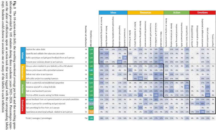 De små detaljer som gör metoden robust – rimlig rytm, tydlig kommentarton, design av innehåll – kom från praktiska projekt med skiftande krav. Längs vägen växte en viktig insikt fram: det är de känslomässiga handlingarna som bygger de svårfångade förmågorna. När vi kartlade entreprenöriella kompetenser såg vi hur uppdrag som riktade uppmärksamheten utåt gav snabbare lärkurvor än abstrakta kompetenslistor för lärandemål. När vi följde yrkeselever blev görandet den ledande indikatorn på vad de faktiskt lärde sig. Metoden blev därmed inte bara ett sätt att samla data, utan också ett språk för att forma beteenden som leder till djupt lärande. Tabell 2.3 är från forskning ihop med mina egna studenter och visar vilka handlingar som driver de så kallade entreprenöriella förmågorna i just den kontext de befinner sig i.