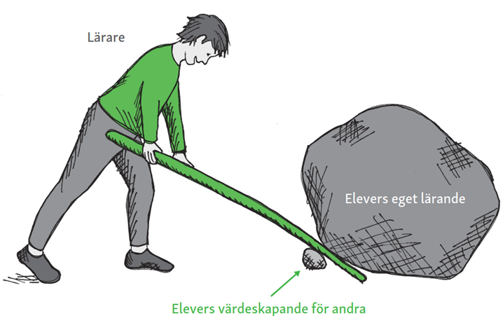 Med nya glasögon såg vi nya saker. Det som bar studenternas engagemang var sällan drömmen om en egen juridisk person i form av ett företag som skulle startas, utan snarare ögonblicken när deras arbete skapade något som betydde mycket för någon annan. När de skrev om dessa stunder ändrade texterna ton: känslorna blev starkare, sammanhangen tydligare och lärdomarna djupare. Där och då började vi tala om värdeskapande lärande, inte bara som ett nytt koncept utan också som en observerbar mekanism. När många gjorde egna insatser som hjälpte andra, och reflekterade öppet om hur det gick, uppstod ett lärande som nådde längre. Figur 2.2 är från min bok om vår forskning kring värdeskapande lärande i grundskola och gymnasium, och illustrerar metaforiskt hur små handlingar, rätt placerade, kan förflytta lärandet i stor utsträckning.