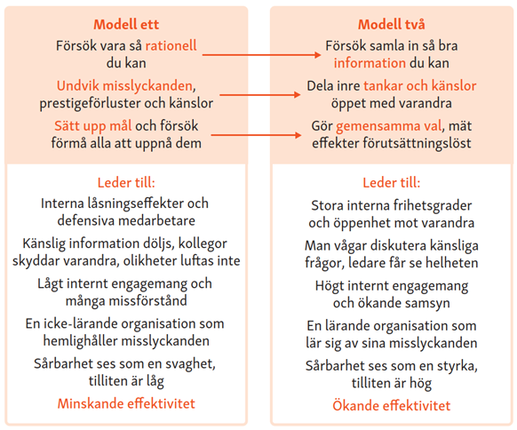 Drömmen om en lärande organisation har funnits länge, men ofta har den stannat i värdeord. Med DAS blir drömmen mer möjlig att uppnå. När människor får reflektera förtroligt om känsliga frågor i sitt vardagliga arbete, när ledare speglar med respekt och när mönster läses tillsammans, då förändras samtalstonen. Vi rör oss från försvar till utforskande, från det forskaren Donald Schön kallar Modell 1-organisation mot en Modell 2-organisation, se figur 2.9 nedan. Små beslut tas oftare och närmare golvet, och kunskap cirkulerar genom så kallade communities of practice som delar uppdrag och designprinciper över gränser.