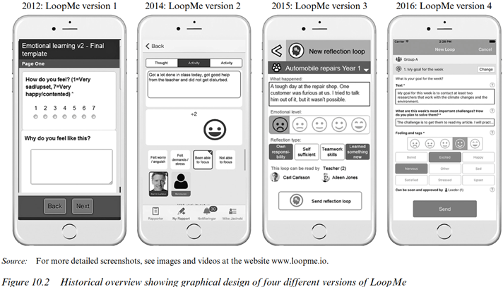 Ett avgörande skifte kom 2015 när uppdrag blev obligatoriska i designen, vilket gjorde användningen mer uthållig över tid och datan mer jämförbar. Under det andra decenniet, från 2022 och framåt, har utvecklingen av Loopme alltmer kretsat kring analysstöd: översikter som går att generera på sekunder, värmekartor som visar var effekterna samlas, citatkluster som ger mönster en mänsklig röst och AI-stöd som sparar tid utan att ta kommandot. Vi fick med tiden allt fler synergier när plattformen stöttade både deltagarnas reflektioner och ledarnas analysförmåga – det sporrade båda dessa parter. Vi lärde oss att teknikens roll är att göra det vetenskapliga arbetet lättare, inte större. I figur 2.4 från ett bokkapitel i en amerikansk metodbok syns de fyra första versionerna av LoopMe som visar hur funktioner och utformning mognade alltmer.